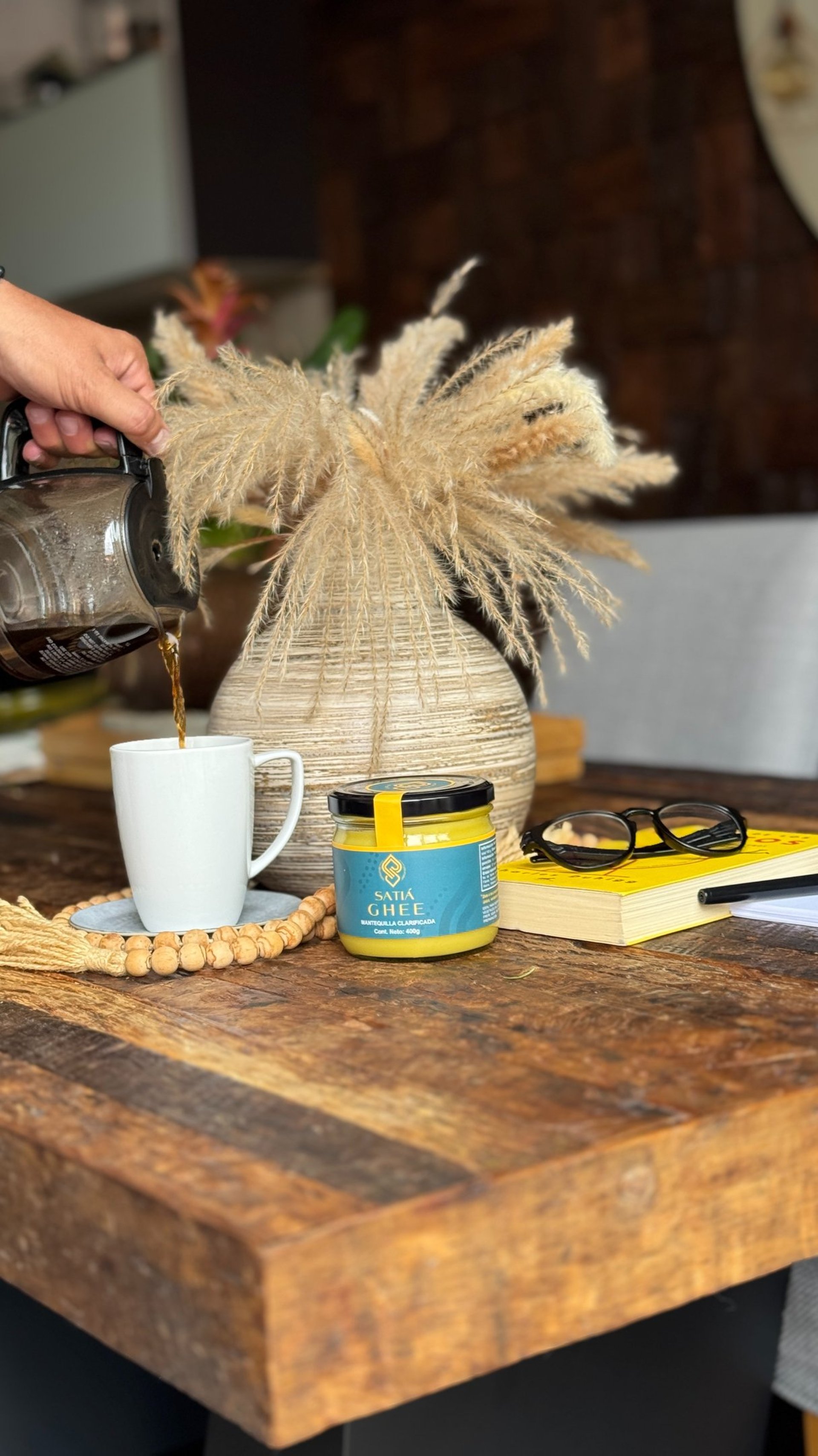 Nuestra mantequilla ghee es elaborada artesanalmente a partir de mantequilla orgánica pura de vaca, mediante un proceso de clarificación lenta que conserva sus propiedades naturales. Los productos se presentan en envases de vidrio de 175g y 400g.